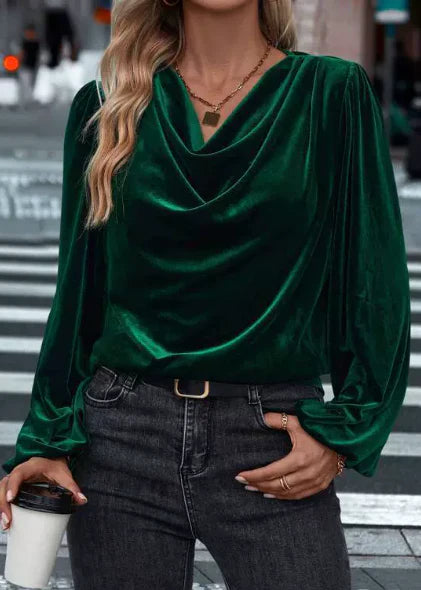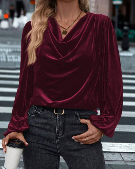 Ilyana – Aksamitna bluzka z długim rękawem i drapowanym kołnierzem